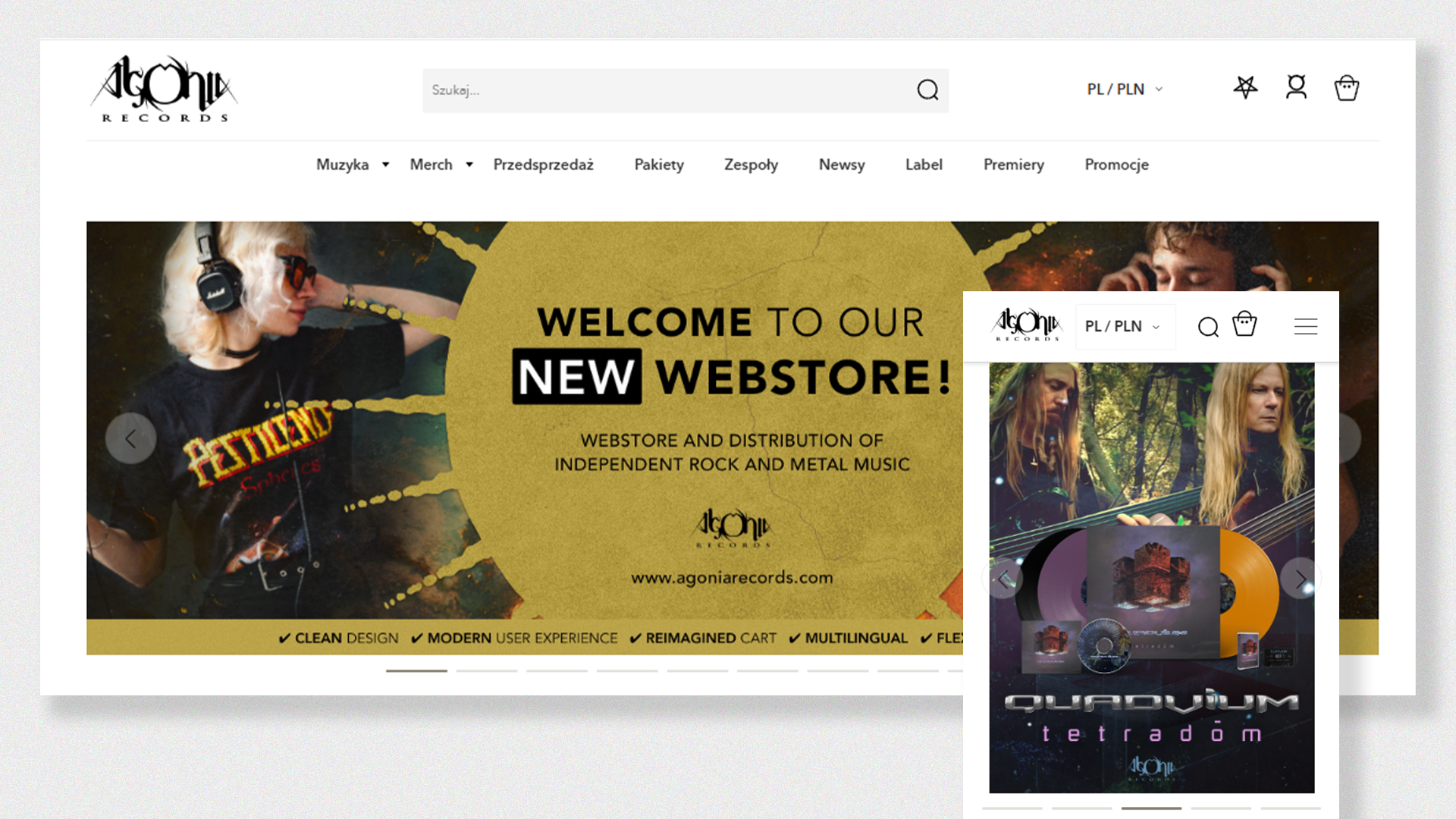 Platforma Agonia Records działa obecnie na Magento 2, w oparciu o motyw Luma oraz customowy frontend przejęty od poprzedniego wykonawcy. Z perspektywy architektonicznej ważną decyzją było skoncentrowanie się nie tyle na przebudowie rozwiązania, co na jego ustabilizowaniu. Projekt był już w zbyt zaawansowanym stadium, by uzasadnione było projektowanie architektury od nowa, dlatego priorytetem stało się przywrócenie poprawnego działania istniejących elementów.