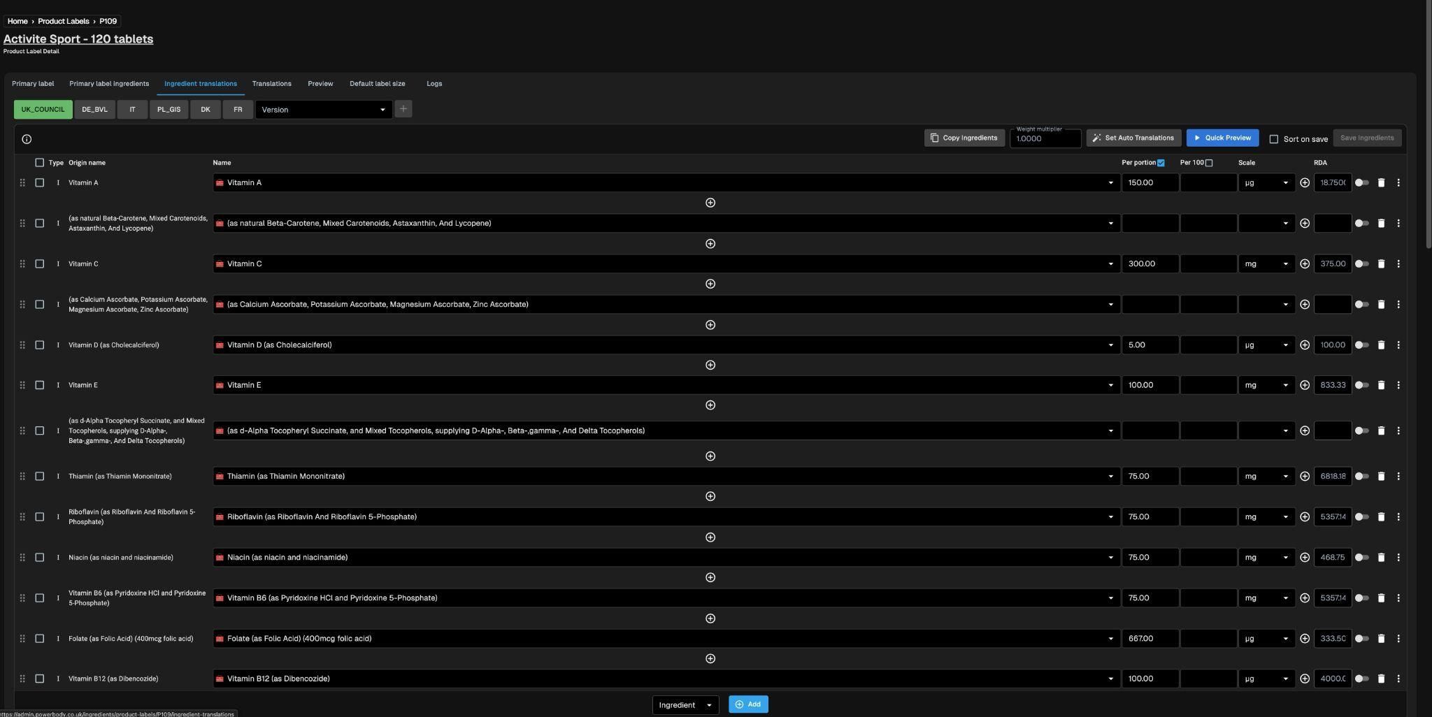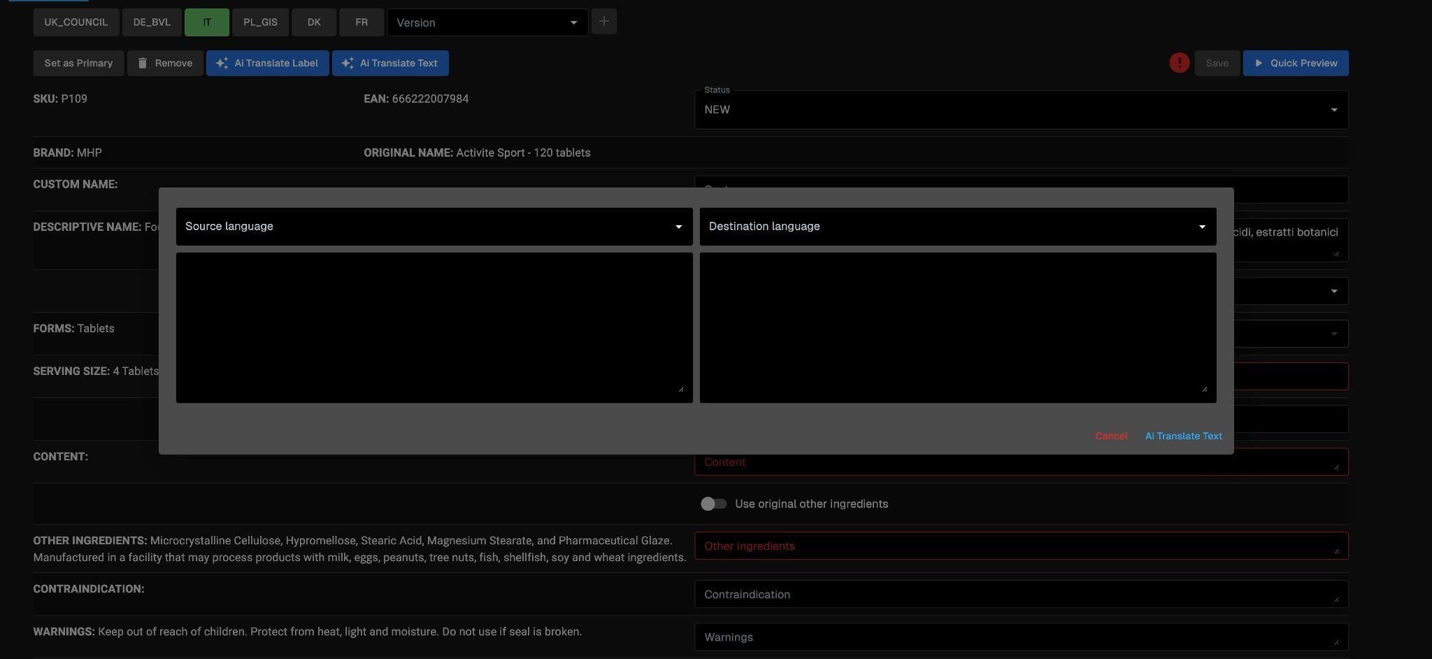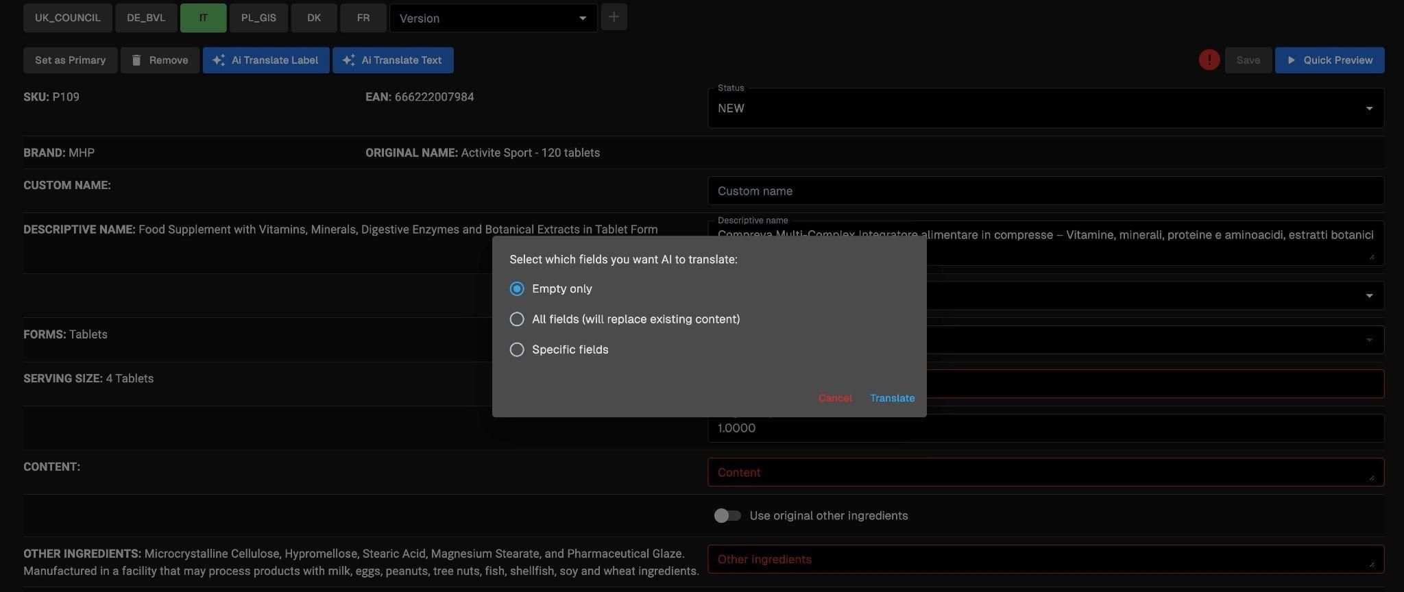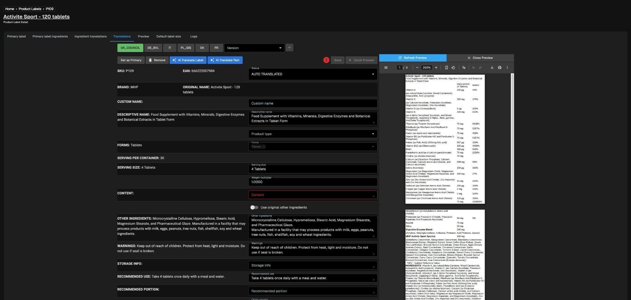Po dodaniu produktu etykieta źródłowa jest przepisywana do systemu i w ten sposób powstaje “primary label” - surowa wersja bazowa. Gdy primary label jest gotowy, proces tłumaczeń dalej przebiega dwutorowo, w przypadku pierwszej ścieżki etykieta docelowa jest automatycznie przygotowywana i publikowana na stronie sklepu. Natomiast druga ścieżka daje możliwość wyłączenia pewnych wersji z autotranslacji i przekazanie ich do weryfikacji pracownika sklepu. Nazwy składników w obu przypadkach przechodzą przez DeepL, co porządkuje terminologię i zapewnia wysoką jakość tłumaczenia. Na każdym etapie dostępny jest podgląd, który pozwala ocenić poprawność językową i układ treści przed publikacją na stronie lub drukiem.